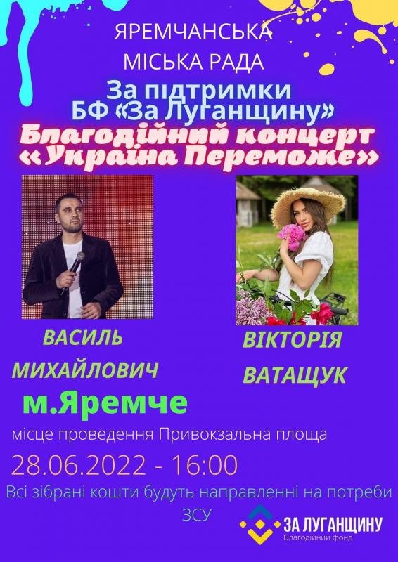 28 червня о 16:00 на привокзальній площі м. Яремче розпочнеться Благодійний концерт "Україна Переможе". Запрошеними артистами будуть: Василь Михайлович та Вікторія Ватащук.
